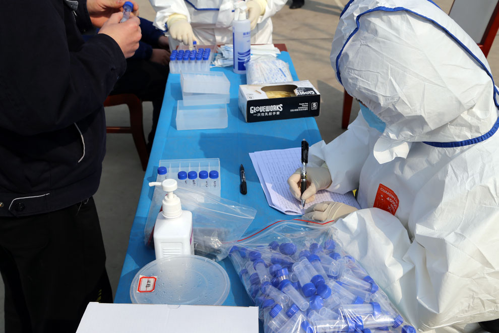 上午11點,中航電測西安中心園區(qū)第二批入園員工在綜合管理部的組織下,陸續(xù)來到南區(qū)廣場,所有員工均佩戴防護口罩,按照已定順序分散站隊,依次領(lǐng)取標(biāo)記順序的細(xì)胞保存液,由醫(yī)務(wù)人員依次采集“咽拭子”細(xì)胞標(biāo)本。醫(yī)務(wù)人員再將采集好的“咽拭子”細(xì)胞標(biāo)本統(tǒng)一運送至實驗室進行檢測,統(tǒng)一出檢測結(jié)果。