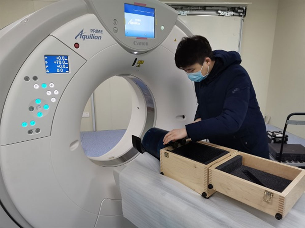 當(dāng)前疫情防控仍處在吃勁的關(guān)鍵階段,醫(yī)護(hù)人員還在前線同病毒抗?fàn)帯T卺t(yī)院各個(gè)科室,除了有醫(yī)護(hù)人員的忙碌,還有許多計(jì)量人的身影。日前,揚(yáng)州市寶應(yīng)縣第二人民醫(yī)院聯(lián)系江蘇省計(jì)量院,用于新冠肺炎篩查診斷工作的CT機(jī)急需現(xiàn)場檢測。2月25日上午,江蘇省計(jì)量院醫(yī)學(xué)所兩名檢定員走進(jìn)醫(yī)院科室開始了計(jì)量檢測。